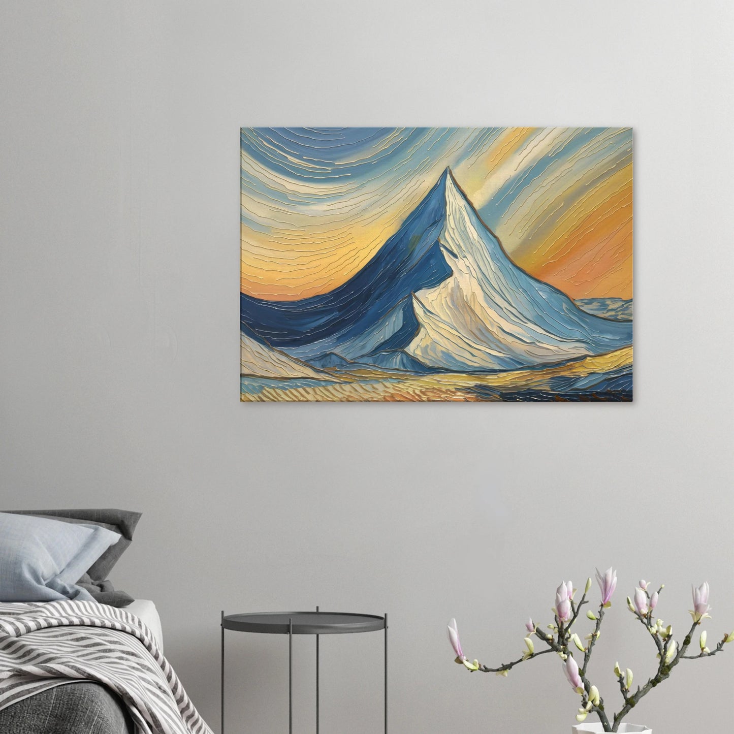 A majestic mountain peak, dominating the center, with its contours highlighted by swirling patterns of blue and white. The sky above is painted in a gradient of colors, transitioning from a deep blue at the top to a warm orange near the horizon. The mountain's base is depicted with intricate patterns, suggesting a textured terrain, possibly a field or meadow. The entire artwork exudes a sense of movement and fluidity.